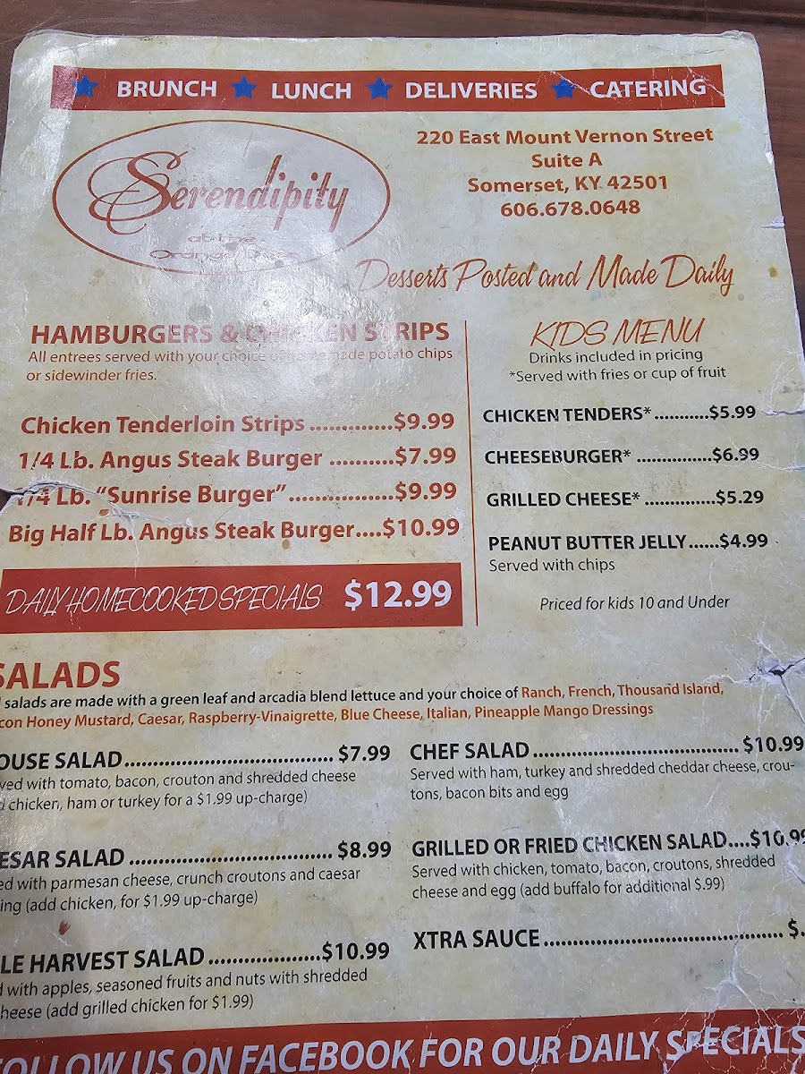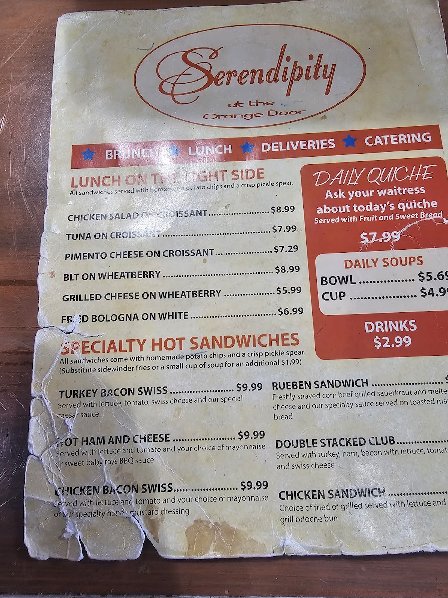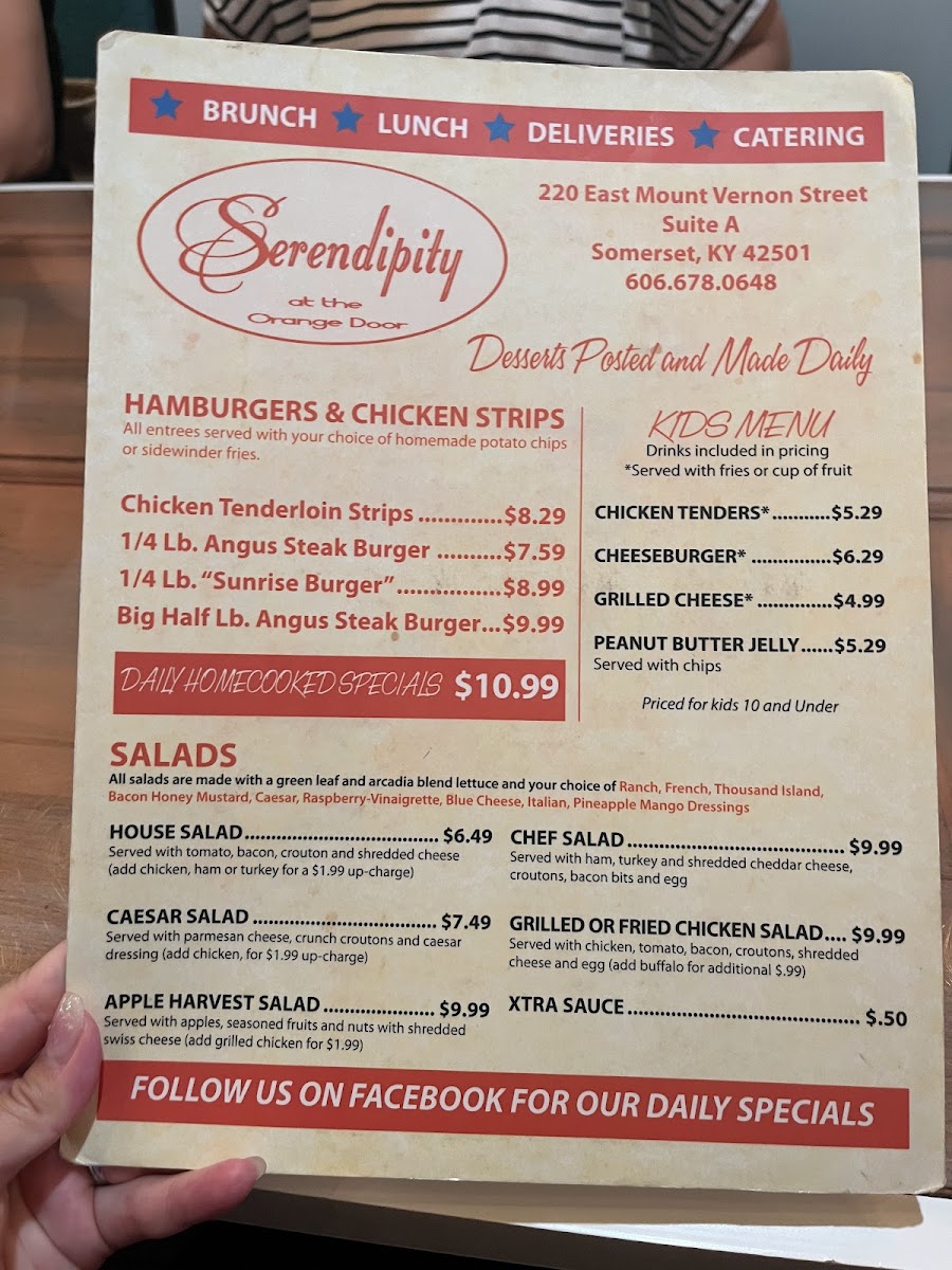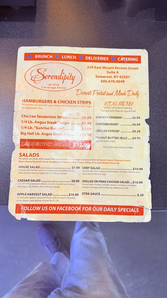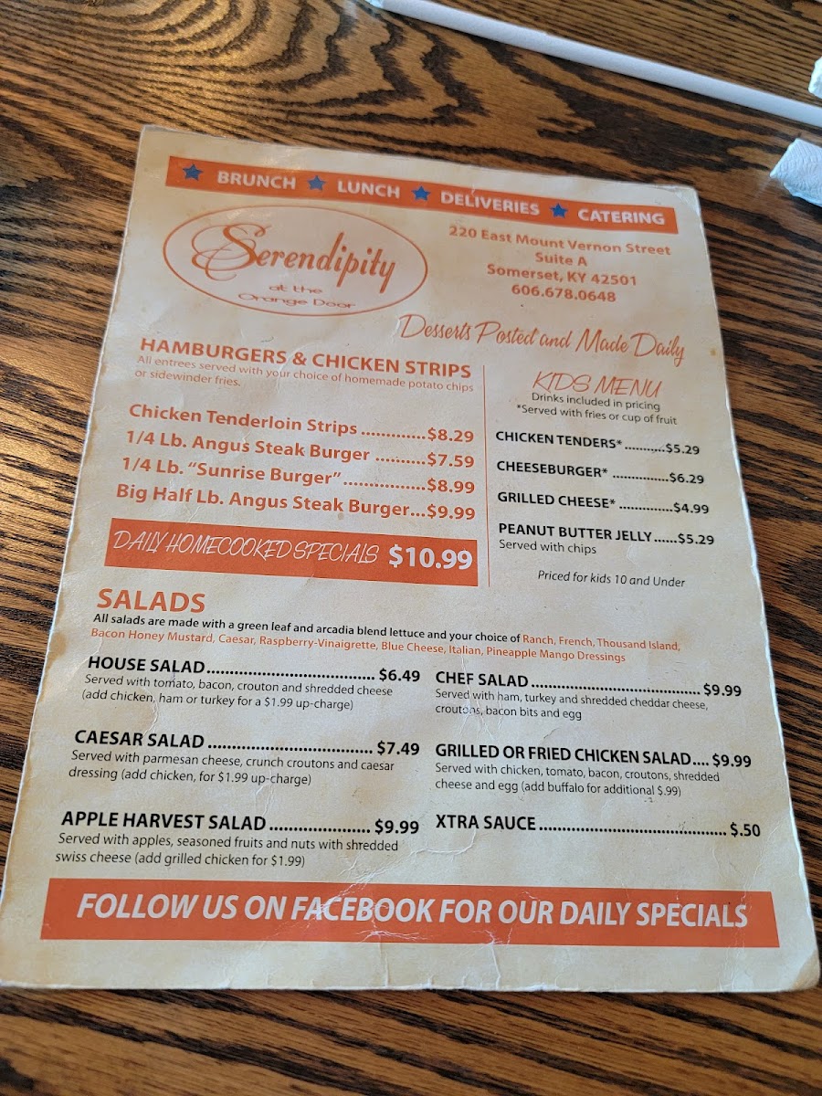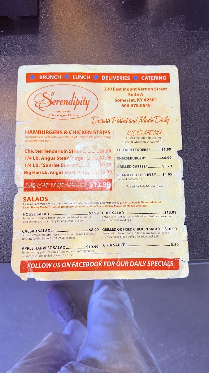 At Serendipity At The Orange Door Menu, every dish tells a story, inviting you to explore a unique blend of flavors. Located at 113 Trade Park Dr in Somerset, KY, this charming spot offers a variety of options to satisfy any craving, whether you're in the mood for something comforting or adventurous. From fresh, locally sourced ingredients to bold, creative twists on classic dishes, the menu here is designed to take you on a flavorful journey.
